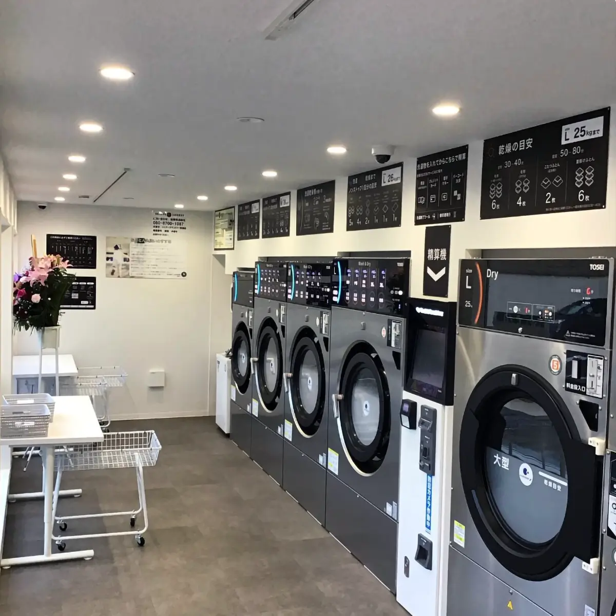 乾燥機はLサイズ(~25kg)1台、Mサイズ(~14kg)6台を備えており、